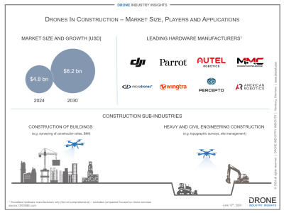 The Commercial UAV News “Sector Snapshot: Drones in Construction” explores how construction professionals are finding new and better ways to incorporate uncrewed aerial technology in their projects. The report explains how drones are being used to manage and monitor worksites, address quality control issues, and collect large amounts of valuable data. It also shows how construction pros are investigating ways of incorporating artificial intelligence (AI), machine learning, and other innovations into their drone-based work.