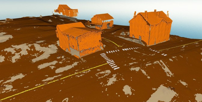 The workflow in Global Mapper Pro does not need to end with a classified point cloud. While the data can be exported to one of many supported point cloud formats, including LAS/LAZ, a terrain model can be generated, contours created, breaklines extracted, and much more. Features can also be extracted from the classified point cloud through the Automatic Point Cloud Analysis tool, or by generating bounding areas that help to smooth out the extracted areas. In this dataset the custom road centerline and crosswalk classified points can be extracted and converted to line features accurately representing the markings on the road.