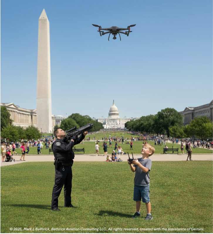 Domestic CUAS operations in the U.S. are far more complex than overseas military scenarios. I experienced this first-hand as the architect of the U.S. Department of the Interior’s (DOI) “Drones for Good” program and DOI Director of Aviation. In the early 2000’s we began to see consumer drones over National Park Service lands, like the National Mall. Soon I started receiving questions from law enforcement about whether these drones could be “taken down.” In addressing these questions, I came to realize how much more complicated domestic “counter-air” ROE was. This complication was exemplified by the infamous gyrocopter landing near the Capitol Building in 201539 and repeated instances of children and their families coming to the National Mall to try out their new birthday/Christmas drone, unaware they were flying in prohibited airspace.40 Unlike overseas combat zones where ROE are shaped by the Law of Armed Conflict and the presence of hostile actors, domestic CUAS engagements often occur over densely populated areas filled with civilians, public venues, and vital infrastructure, none of which can be treated as expendable or collateral damage. Every person and structure under U.S. airspace is protected, raising the stakes for any CUAS action.
