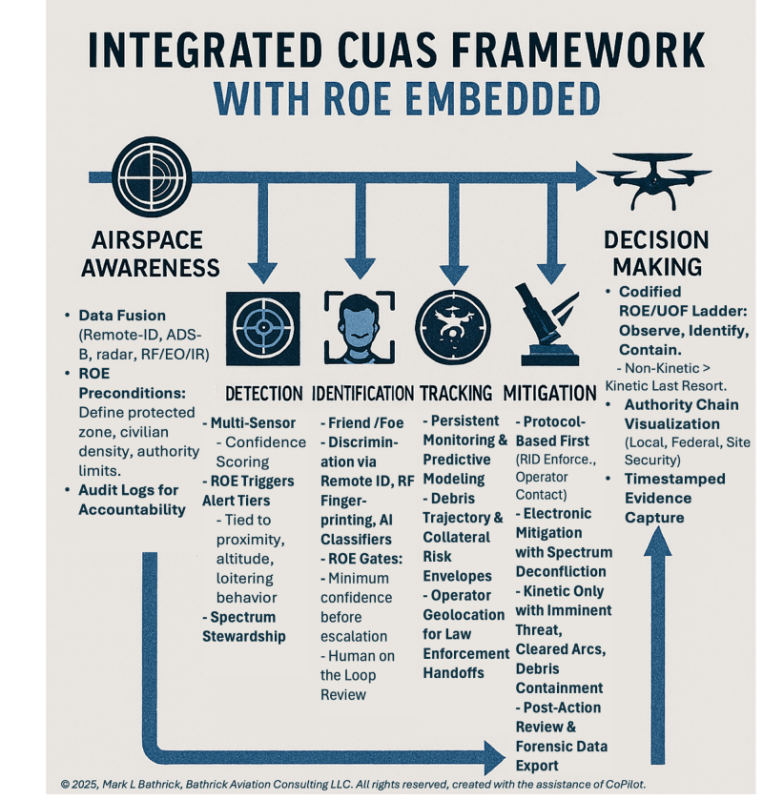 The contrast between overseas CUAS operations and domestic U.S. scenarios underscores a critical gap in our current approach: while industry and government continue to emphasize technological detection, tracking, and mitigation capabilities, far too little attention has been devoted to the formulation, training, and integration of ROE across every element of these systems. The tragic consequences of failed or unpracticed ROE in complex, low‑altitude airspace environments demonstrate that technology alone cannot safeguard the public or ensure lawful, proportionate responses. To truly support time‑critical decision making, ROE considerations must be woven into airspace awareness, detection, identification, tracking, and mitigation layers, transforming them from isolated technical functions into a cohesive, accountable framework. Closing this gap requires a deliberate effort to instill balanced, domestic‑aligned ROE that promotes both safety and security—ensuring that CUAS systems not only neutralize threats effectively, but also uphold the principles of restraint, proportionality, and public trust that are essential in the U.S. homeland context.