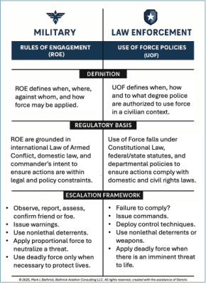 Drones uniquely invert the traditional risk balance between operators and targets, eliminating the attacker’s personal vulnerability while exposing the defender to sudden, asymmetric danger. This presents a challenge for traditional law enforcement use-of-force policies, as seen in the Russo-Ukraine War where drones were used in coordinated swarms. Law enforcement frameworks are designed for civilian contexts, emphasizing proportionality and direct human confrontation, whereas military rules of engagement in counter‑air and air defense applications are explicitly structured to manage rapid identification, classification, and neutralization of aerial threats under conditions of uncertainty and massed attack. Military ROE provide the doctrinal flexibility, escalation authority, and operational clarity necessary to respond decisively to drones that can be deployed remotely, at scale, and without risk to their operators—making them far more aligned to the realities of CUAS engagements than the civilian policing standards that lack both the scope and the speed required for such threats. For these reasons, we will use ROE in discussing CUAS engagement protocols.