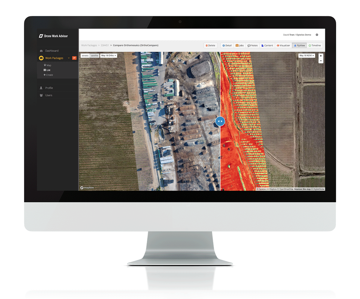 FlyView OrthoCompare from Optelos is set to resolve issues drone operators are having with managing, analyzing or sharing their data as needed. This new tool is designed to make things simple and easy for users by enabling drone operators to overlay and compare high-resolution orthomosaics from any browser. Optelos is looking to bring together workflow and AI analytics to allow commercial operators to properly handle all of the data that’s being gathered for a project.The orthomosaic datasets that professionals need to create are typically hundreds megabytes to several gigabytes in size and in a special file format, which can make the process to manage and share this information difficult. It’s something that David Tran, CEO of Optelos, has heard loud and clear from his customers, which helped guide the creation of this product.“One of their biggest challenges for operators was to easily deliver large orthomosaic files to all their clients and provide the ability to view and interrogate the data,” Tran told Commercial UAV News. “Moreover, many users wanted the ability to compare multiple orthomosaics over time to see changes and gain other insights. These challenges diminished the value of the data and overall end-user experience.”Those challenges are set to be simplified by a simple three-step process.- Upload GeoTIFF: Operators export their orthomosaics in GeoTIFF format to the Optelos Drone Work Advisor platform.