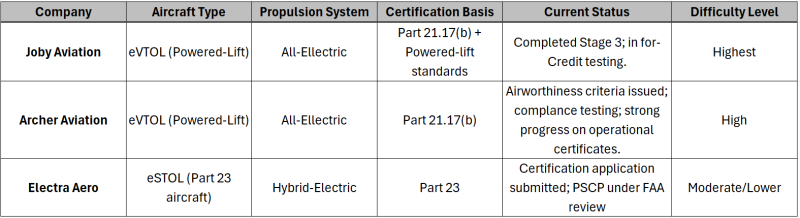 This divergence has strategic implications. Joby is closest to type certification and is shaping the FAA’s understanding of powered‑lift aircraft. Archer is building the operational infrastructure that will support early air taxi networks. Electra is pursuing a lower‑risk certification path that could enable regional mobility services to enter the market sooner than urban eVTOL operations. Each company is betting on a different combination of technology, regulation, and market timing.