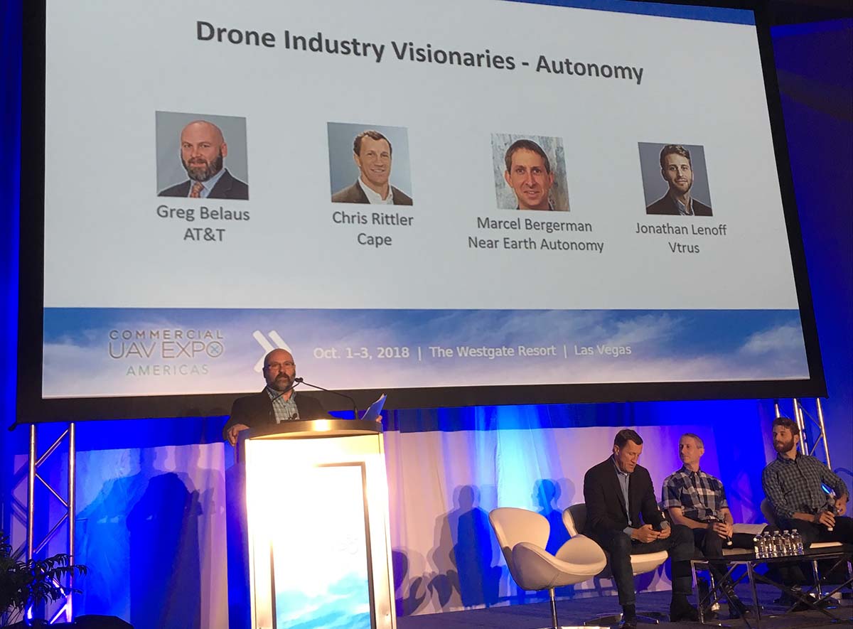 Moderated by Greg Belaus from AT&T, Chris Rittler from CAPE, Marcel Bergerman from Near Earth Autonomy and Jonathan Lennoff from Vtrus rounded out the panel, which got off to a quick start with all three of the panelists talking through the very different approaches they’re taking to confronting and leveraging the challenges and opportunities each of them are facing.Chris began by talking about what the San Diego Fire Department is doing with drones as part of the FAA Integration Pilot Program (IPP) to illustrate the benefits of using highly autonomous drones in disaster response situations. He advocated for the addition of the UAV to the organization’s Standard Operating Procedures (SOP) and not the other way around, forcing them to change the way they normally conduct operations.Jonathan explained how his company specializes in indoor inspections and how they are not constrained or regulated by the FAA but instead have to follow strict rules and guidelines from internal corporate policies from their customers. Their ABI Zero product is an autonomous drone designed for indoor industrial inspections, the autonomous capabilities of which could easily be utilized in other contexts and situations.Marcel explained to the audience that it’s inevitable that in the near future there will be hundreds of simultaneous autonomous inspections happening in close proximity. He explained how and why current regulation is not only good but necessary to ensure a global policy of safety first. Chris jumped in to say that the three key factors that CAPE has encountered with customers pursuing autonomy in their UAV operations are safety, cost and repeatability. He elaborated on the third factor by mentioning that their goal is to have the drone take care of the flight while they have experts to take care of the mission.Marcel came back to the theme of safety by saying “It took manned aviation 100 years to reach the current level of safety; I’m sure the drone industry can wait a few years to achieve the same level.”Chris clarified that today’s drones are semi-autonomous and that we are perhaps two years away from fully autonomous UAVs. Marcel by concurred saying that in the near future one pilot will be in a position to supervise 50 drones simultaneously and that would be the mark for full autonomy.Then the conversation took a turn towards communications and Greg, representing AT&T, intervened to say that even though today’s cell networks are not perfect, the improvement over the past few years has been tremendous. The panelists agreed but Chris took the microphone to elaborate.“Autonomy doesn’t work without communications,” he said emphatically. “Every autonomous UAV should have strict protocols in place to guarantee that, in case of a complete loss of communication, the aircraft will either land in a safe place or return to the base following a pre-established path.”Jonathan added that these safety protocols have to be embedded within the drone and that they should be completely independent of communications. Marcel agreed with Jonathan and Chris and added that these safety protocols should take into account environmental issues that might have been the cause for the loss of communication.The conversation then turned to privacy issues, as Chris cited a recent poll in which people were asked about the level of comfort they felt if they saw a drone responding to an emergency situation. Apparently, 62% of the people polled didn’t have a problem with that and the number ballooned to 88% when the individual was told that the drone was autonomous. In other words, the level of confidence in the UAV mission by the public grew as autonomy was introduced.Marcel ended the discussion saying that nothing will help more the case for autonomous drones than a few videos of drones distributing emergency supplies to disaster areas or even rescuing people from dangerous situations as a result of a natural disaster. There was wide agreement throughout the audience and the panelist with this last remark.As developments like the ones from Skyfish have proven, then autonomous capabilities of drones will only get better and more powerful over the next few years. That makes it more important than ever for us to figure out what it will mean to make this technology make sense to the public and for regulators in the United States and beyond.