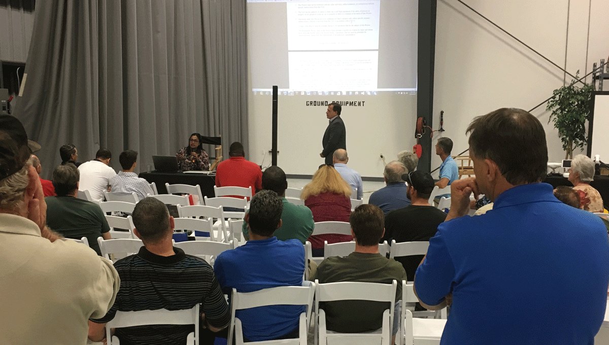 At the session in the Daher-Socata hangar, the crowd was welcomed by Steven Rocco, the manager of Pompano Beach Airpark and also from Bruce Pelly, the Tower manager, who handles requests and notifications from people operating hobby drones in the vicinity of the airport. The presenters included Amanda Quevedo of the FAA Miami FSDO (Flight Standards District Office), Rick Wygant of the South Florida Drone User Group, Josué Tirado, a land surveyor of the Miami-Dade County Public Works’ Division and members of the above mentioned management team at the Pompano airport. The agenda included topics in the areas of UAV’s integration in Urban areas, operations in the National Airspace System (A, B, C, D), FAA regulations, certifications, and documents involved with UAV’s and basic aerodynamic / performance limitations pertaining to drones.