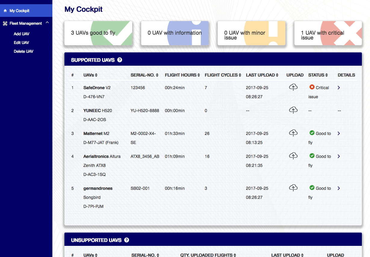 SafeDrone development is initially available for drones from Aerialtronics, germandrones, Matternet as well as the H520 from YUNEEC. Other manufacturers will follow in the coming months. Additionally, the team is already working on enhancements for the product such as preventive warning measures and improved fault identification. All of these efforts as designed to further reduce maintenance effort and improve reliability.