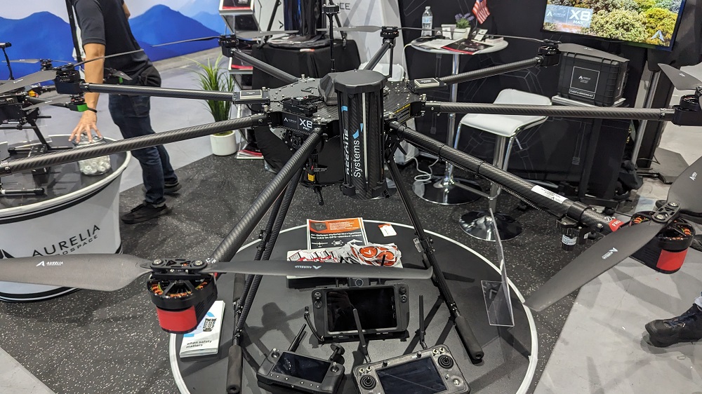 Available in two models that were on display, the Aurelia X8 Standard is the second largest heavy-lift payload drone in the Aurelia family, which also includes the X4 and X6. The Aurelia X8 MAX represents the largest heavy lift payload drone that the company has available, capable of carrying payloads up to 11 kg (24 lb). Those capabilities along with features like obstacle avoidance and retractable landing gear plus the cost represent a true differentiator when compared to drones of similar sizes on display at the event.