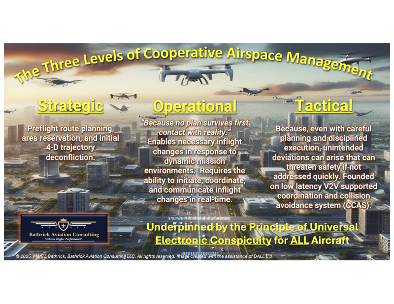 But because the FAA’s low‑altitude approach is cooperative rather than directive and depends on electronic conspicuity among diverse and dynamic use cases (e.g., drone as a first responder DFR), it necessitates a third, Tactical level: a last‑defense, real‑time capability to coordinate and deconflict when unexpected situations and human deviations arise, such as when cooperative aircraft deviate and become collision threats or when non‑cooperative aircraft must also be accommodated. This level requires low‑latency, highly reliable communications and risk calculation that traditional systems do not provide.