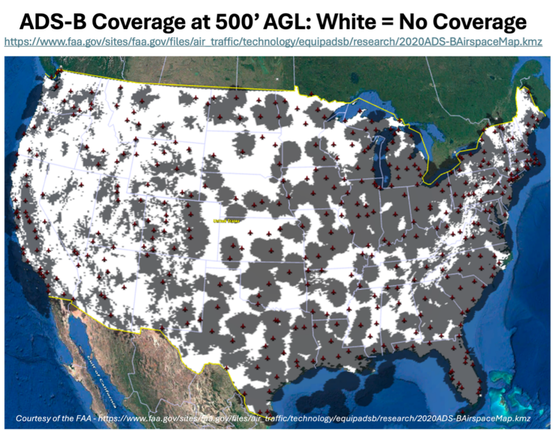 Even when cooperative signals are available, surveillance performance degrades rapidly near the surface. Terrain masking, buildings, vegetation, smoke, and infrastructure clutter interrupt line‑of‑sight reception and create operationally significant coverage gaps. FAA and NASA studies have repeatedly documented reduced ADS‑B coverage and reliability below approximately 500 feet AGL, particularly outside terminal areas and in rural or mountainous regions, precisely the environments central to DFR, wildland fire, weather disaster response, agriculture, and infrastructure inspection missions.