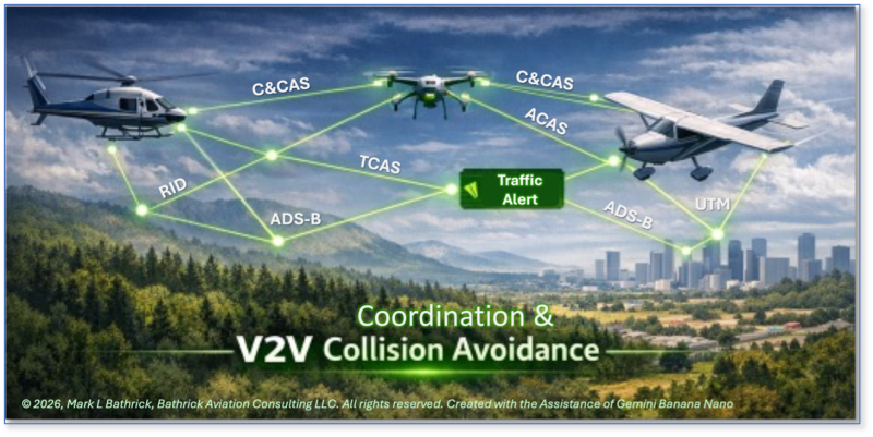 A coordination‑centric architecture that fuses V2V C&CAS with traditional legacy cooperative system inputs (e.g., ADS-B, RID, TCAS, UTM, etc.) and DAA technologies fundamentally changes that equation.50 By enabling low‑latency, peer‑to‑peer exchange of state and intent, V2V‑based coordination and collision avoidance systems provide the missing connective tissue between detection, decision‑making, and action.51 They reduce ambiguity at the tactical level, support compatible avoidance behavior among cooperative aircraft, and allow legacy sensors and counter‑UAS systems to be contextualized rather than over‑relied upon. Most importantly, they offer a credible path toward a shared, transparent, and authoritative understanding of low‑altitude airspace, one that supports safety, security, and public trust simultaneously.52