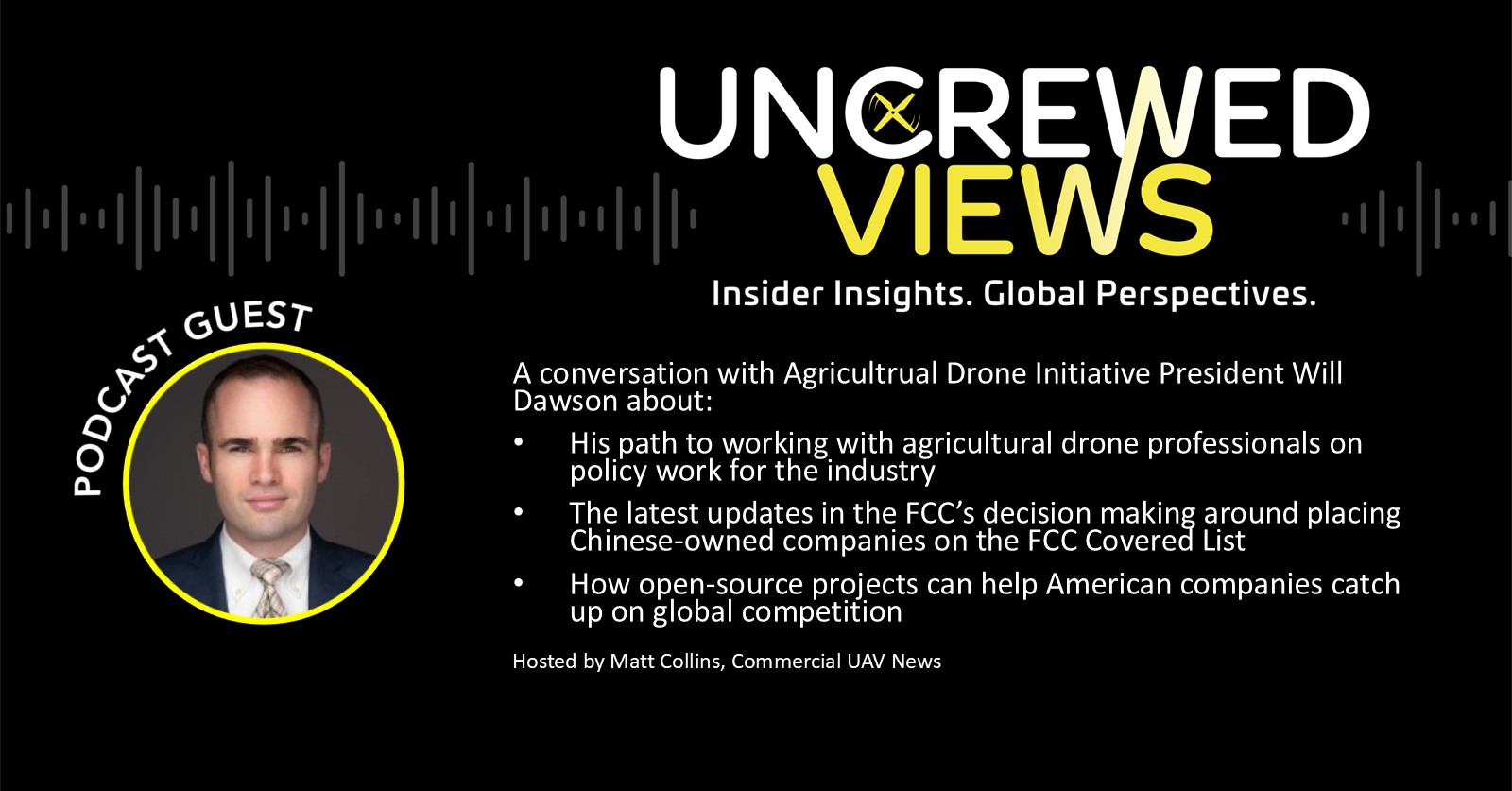 In our latest episode of Uncrewed Views, Matt Collins from Commercial UAV News is joined by Will Dawson, president of the Agricultural Drone Initiative to talk about the latest developments around the FCC’s decision-making to potentially place Chinese-owned drone companies on their Covered List, what impact will be felt by groups like individual pilots and resellers, and how open-source projects can go a long way toward building up the industry in the U.S.