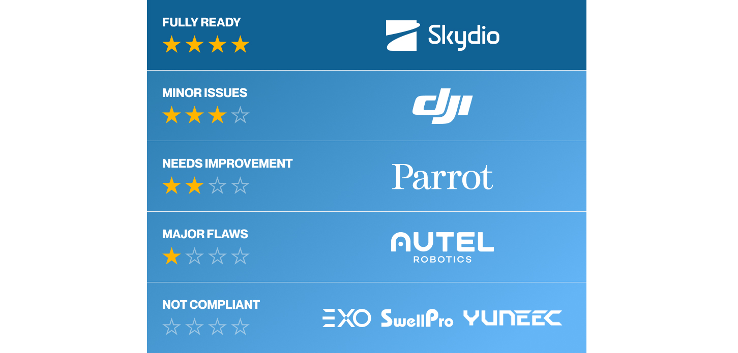The scope of Remote ID implementations discovered by SkySafe’s research team sought to answer questions related to culpability across seven manufacturers: DJI, Skydio, Autel, Parrot, SwellPro, EXO, and Yuneec. If a pilot is found to be operating a standard Remote ID drone that doesn’t follow the required specifications, who is at fault? What agency or entity will hold manufacturers responsible for implementations that do not comply with the ASTM standard for Remote ID?