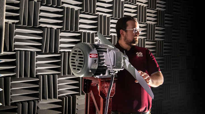 A research lab at Mississippi State University, the Raspet Flight Research Laboratory, has been doing drone flyover noise measurements since 2016. Now, Raspet Flight has built the university’s quietest flight lab, known as an acoustic anechoic chamber, that absorbs reflections of sound waves. Built as part of a collaborative research venture seeking to quiet unmanned aircraft systems, the lab is covered by dozens of eight-inch-deep polyurethane foam wedges in every inch of the 10-by-18-by-10 room’s interior, including its floor.