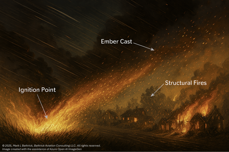The ember field effectively multiplies the incident footprint by orders of magnitude, turning what might have been a contained event into multiple concurrent fires that overwhelm the suppression capacity that was designed to handle individual structural fires, rather than neighborhoods ablaze as the result of ember storms. Once fire breaches the exterior shell of a building, wind-driven fire dynamics often produce intense interior conditions where escape and interior suppression are impossible. Structural vulnerability to embers—unprotected vents, combustible roofing, and adjacent fuels—is a major driver of catastrophic community loss in wind-driven events.