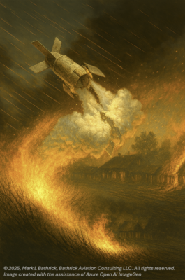 A Possible Future State: Precision suppression assets are prepositioned at forward nodes based on AI-supported predictive analysis. An ignition is detected by satellite or local sensor; within minutes, a prepositioned precision suppression resource launches, compensates for crosswind drift using terminal guidance, and deposits concentrated gel on the nascent head and in the emerging ember field. Ground crews, which previously faced an unmanageable front, now approach a stemmed and localized incident with suppressed ember spread, reducing the risk of entrapment and enabling coordinated containment.