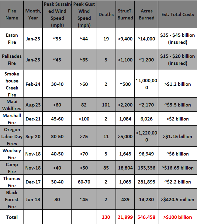 Wind-driven wildfires are no longer an occasional, localized phenomenon; they are the dominant cause of the most catastrophic, fast-moving conflagrations that destroy lives, infrastructure, and regional economies.4 In the western United States and several other regions, a specific class of wind-driven events—downslope and extreme-wind–driven fires—now account for an outsized share of burned area (over 500 million acres), structure losses (~22,000), costs (~$100 billion), and fatalities (230), as shown in the table below. Wind-driven wildfires not only increase the speed and intensity of fire spread, but they also add significant difficulty in safely and effectively delivering suppression in initial attack.5